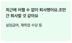 | 퇴사 사유 | 비자발적 퇴사 (권고사직), 임금체불, 직장 내 괴롭힘, 계약 만료(계약직,공사), 자녀 양육, 가족 간병(제한적) 등 |